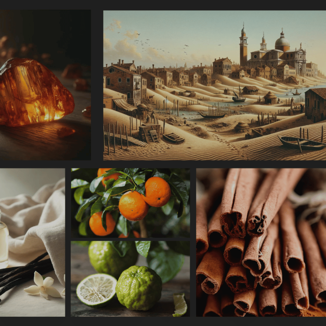 Il profumo di mirra, vaniglia e ambra richiama le dune di sabbia che un tempo ricoprivano questo sestiere, prima che diventasse la zona più modaiola della città. Le note di arancio e bergamotto si mescolano con la calda cannella, creando un inizio dolce e intrigante.